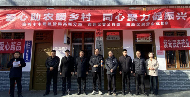 凛冬送暖,情系乡邻。12月13日,宝鸡市高新区非公党委、宝鸡市市场监管局高新分局、宝鸡高新区民营企业协会赴陈仓区赤沙镇宁里巴村组织开展“乡村振兴爱心送温暖活动”。我公司捐赠价值12000元药品,慰问当地群众,助力乡村振兴。
